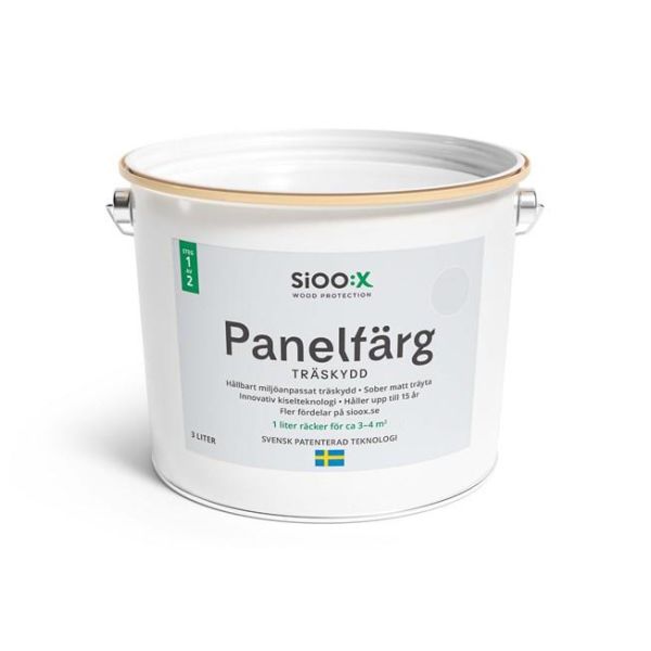 SiOO:X Träskyddande Panelfärger är vattenbaserade och miljöanpassade. Med olika färgnyanser i grå, svarta och bruna toner sätter du din egen prägel och får en sober matt yta från start. Panelens karaktär skiftar till viss del över tid med naturliga variationer. Användningsområden är fasader, staket och andra vertikala ytor. Finsågade ytor har längre hållbarhet och rekommenderas. Även strukturerade ytor kan användas.