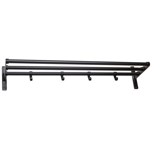 Art.nr: 4065342Hatthylla med konsoler och krokar av aluminium. Rör av plastöverdraget stål eller trä.