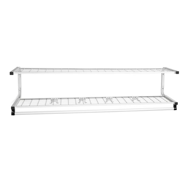 Hatthylla av stål. Hyllplanet är vitlackerat eller svart med konsoler och galgstång i förnicklat, svart eller vitt utförande.