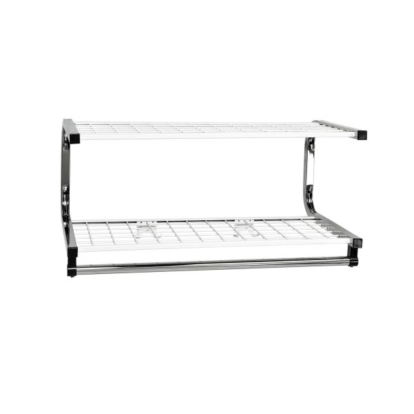Hatthylla av stål. Hyllplanet är vitlackerat eller svart med konsoler och galgstång i förnicklat, svart eller vitt utförande.