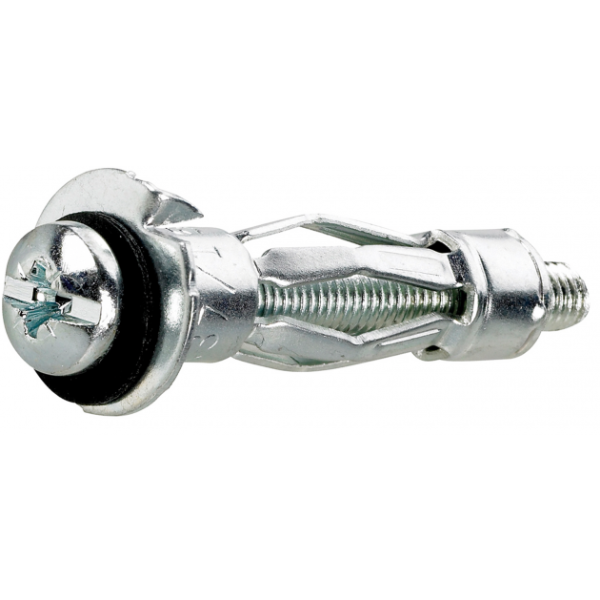 Plant huvud med två låstaggar. Kragad hylsa med M-gänga. 3-5 gripvingar beroende på storlek. Monteras i förborrat hål och gripvingarna expanderar på skivans baksida med hjälp av specialverktyg. För infästning i gipsskivor, spån- och träfiberplattor. Levereras komplett med helgängad skruv. Elförzinkad för inomhusbruk.