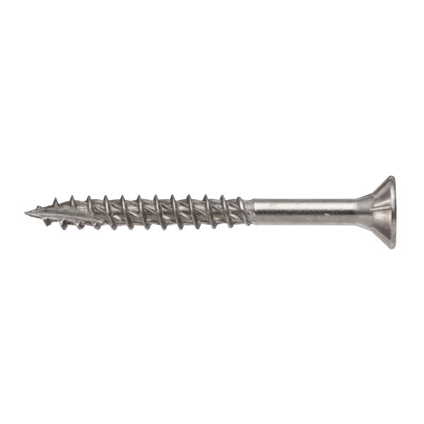 Träskruv med försänkt huvud. TX-skalle. Skruvens unika idragningsegenskaper har uppnåtts genom att förse skruven med en skärande borrspets, samt med snedställda och längsgående skär mellan gängorna.