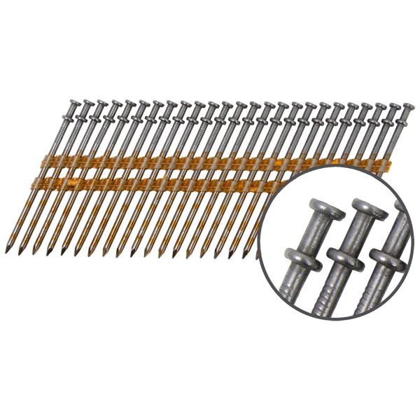 Användningsområde: Inomhus och i torra miljöer för att fästa samman virkesdelar i trä. Lämplig att använda vid formsättning och tillfälliga konstruktioner, t ex stomsträvor under byggnation. Övrigt: Dubbelhuvad bandad spik 21° lutning. Glesbandad med runt fullhuvud. Passar till TJEP FH 21/90 GAS 2D Duplex.