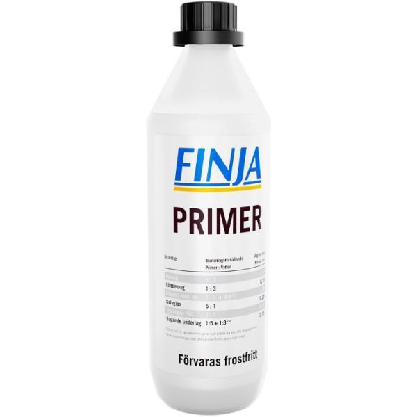 Finja 599001 är en vattenspärbar, icke diffusionstät primer som används vid förbehandling av de flesta sorters underlag som ska behandlas med Finjas spackel- eller plattsättningsprodukter. Primer 599001 har en hög vatten- och alkalibeständighet som säkerställer en god vidhäftning. Bildar även en film som tätar luftporer och därmed minskar risken för blåsbildning i avjämningsmassan. Lägsta filmbildningstemperatur är 10 ˚C.