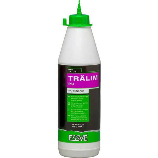 ESSVE PU är ett bärnstensgult trälim på 750 ml som är helt vattenfast och baserat på Polyuretan. Limmet har en utfyllande förmåga och skummar upp något under härdning, dosera måttfullt.
