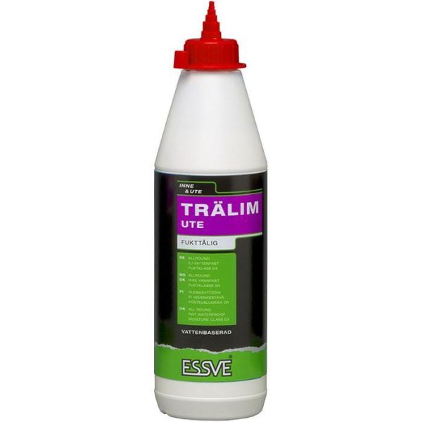 ESSVE Ute är ett transparent trälim på 750 ml för utebruk i ej konstant fuktutsatta applikationer. Limmet håller fuktklass D3 vilket innebär att det tål att bli vått - men är ej vattenfast över tid utan måste få torka ur.