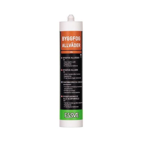 ESSVE Allväder är ett byggfog baserad på en unik gummilösning som fäster och tätar massan i alla väder oavsett tid på året och förutsättning. Ger en mycket elastisk tätning som är helt väderbeständig. I transparent utförande.