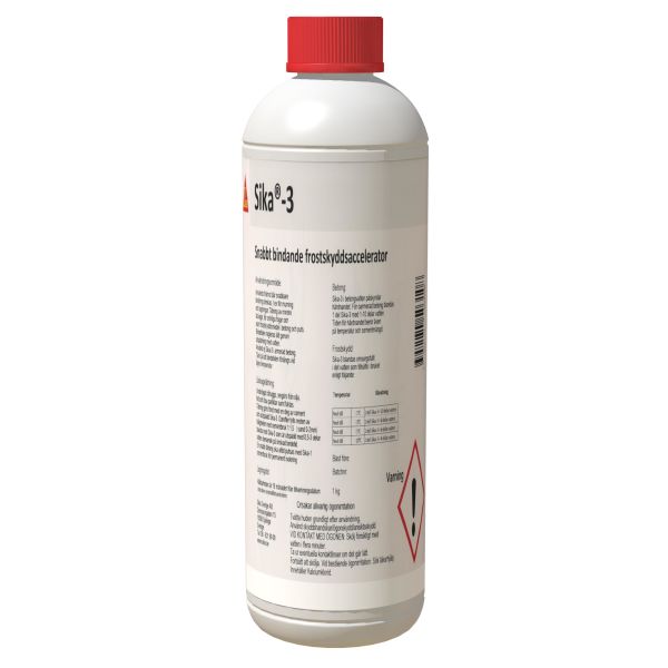 Sika-3 är en fryspunktnedsättande, accelererande tillsats baserad på kalciumklorid. Används främst där snabbare bindning önskas, t ex för murning och lagningar, tätning av mindre läckage, för orörliga fogar och som frostskyddsmedel i betong och puts.