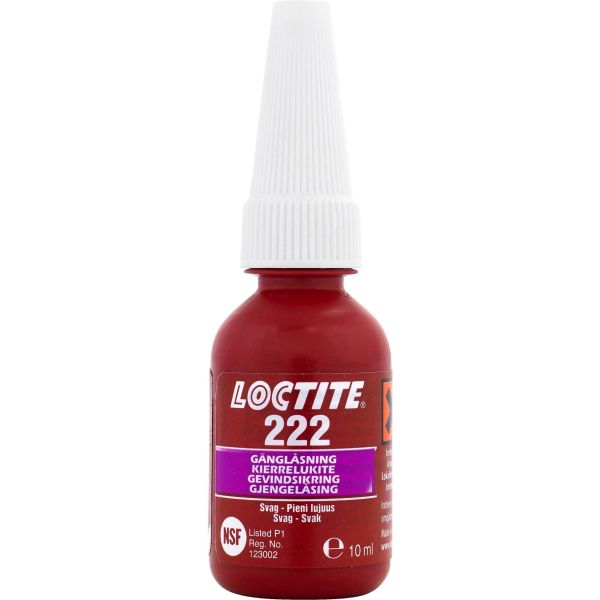 Loctite® 222 är en gänglåsning med låg styrka som medger justering av skruvar, inklusive skruvar med försänkta huvuden och ställskruvar. Lämplig för metaller med låg styrka som där det finns risk för brott vid demontering, t.ex. aluminium och mässing. Produkten fungerar på alla metaller, inklusive passiva material (t.ex. rostfritt stål, aluminium och pläterade ytor). Motståndskraftig mot mindre föroreningar av industrioljor, t.ex. maskinoljor, korrosionsskyddsoljor och skärvätskor.