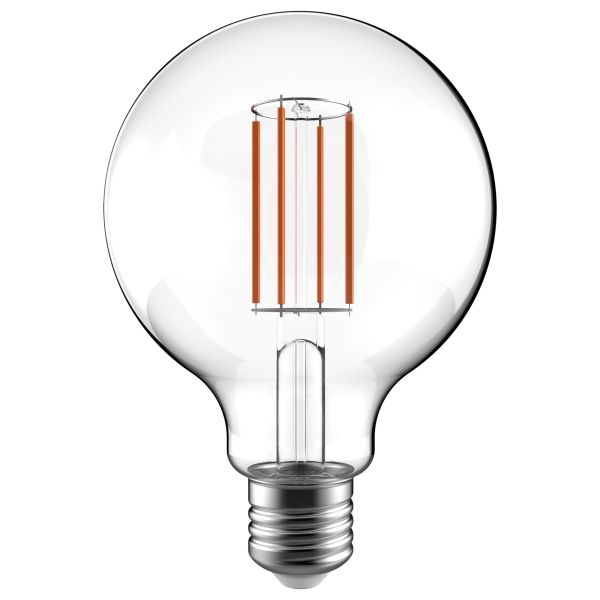 Dekorativ Led-lampa tillverkad med filament-teknik vilket gör att den lämpar sig som ersättare till traditionella, klara glöd- och halogenlampor. Ljuskällan sprider mycket ljus ner mot sockeln, vilket gör att den passar extra bra till armaturer där lampan installeras med sockeln nedåt. Ljuskällan sprider ett ljus med klar ton (3000 K) och kan med fördel användas utan skärm.