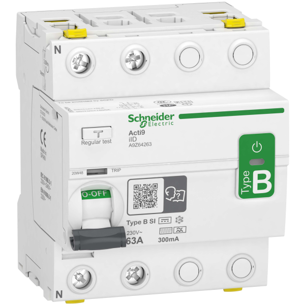 Schneider Electric Acti9 iID är en jordfelsbrytare av typ B-SI som är korttidsfördröjd 10mS och har förhöjd stötströmstålighet 3kA. Jordbrytare av denna typ är även försedda med ett inre skydd som gör dem anpassade för fuktiga och aggressiva miljöer. I 2-poligt utförande, momentan med märkfelström 63A, 300mA.