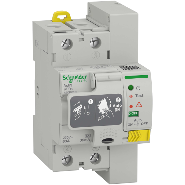 Schneider Electric Acti9 REDs är en 2-polig jordfelsbrytare i klass A med märkfelström 63A, 30mA. Gör 3 återställningsförsök efter varandra och därefter kontrollerar den var 15:e minut om jordfelet kvarstår. När jordfelet är avhjälpt återgår jordfelsbrytaren i driftläge.
