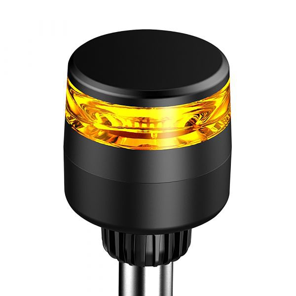 Runtomlysande varningsljus med aluminiumbas avsedd för stångmontage. Lättplacerad och passar i trånga utrymmen.