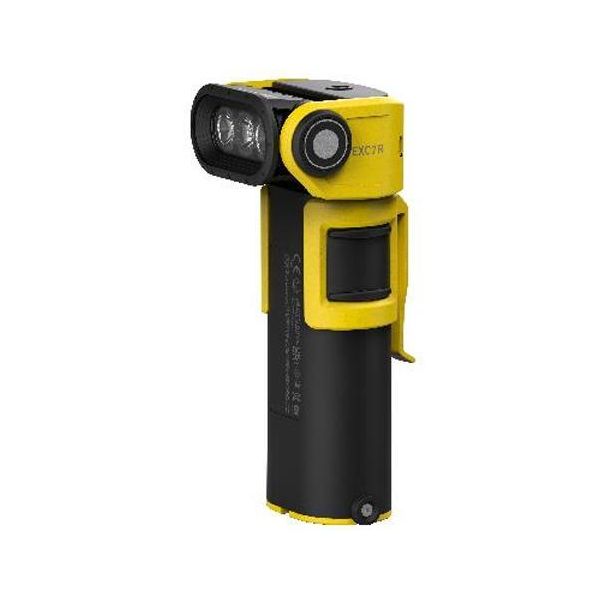 EXC7R uppfyller DIN 14649-standarderna och är en pålitlig rätvinklig lampa för bla brandmän under mer krävande förhållanden. Det är möjligt att växla mellan ett fokuserat helljus och en utbredd strålkastare för att ge idealisk belysning i en mängd olika av situationer. Lamphuvudet svängs både uppåt och nedåt, medan klämman kan fästas på båda sidor för att säkerställa flexibilitet i användningen. Tack vare dess integrerade, kraftfulla batteri med batteri och laddningsnivåindikator, långa perioder av användning är inget problem. Reflektorerna på lamphuvudet säkerställer förbättrad synlighet vid användning. Explosionsskydd: Ex bl.a IIC T4 Ga, Ex ib IIIC T135°C Db