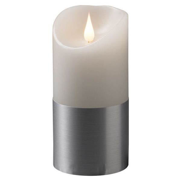 Konstsmide 1821-300 är ett vaxljus på 7,5x15,5 cm, vitt med silverfolie LED timer 4/8h 2xC.