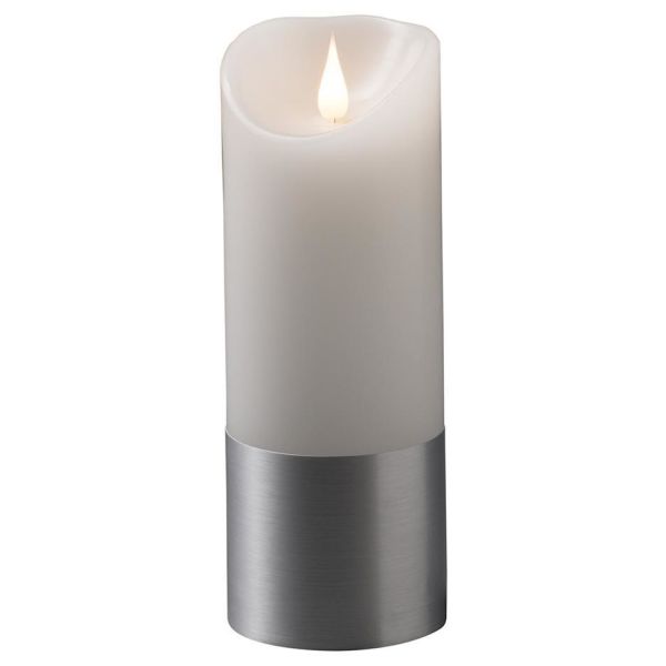 Konstsmide 1823-300 är ett vaxljus på 7,5x20,5 cm, vitt med silverfolie LED timer 4/8h 2xC.