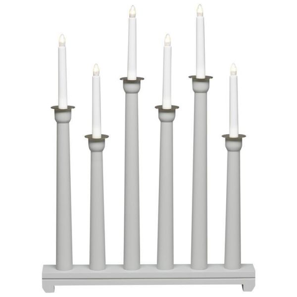 Konstsmide 3978-310 är en är en elljusstake med 6 ljuspunkter, av trä i grå med mässingsdekoration 230V/IP20.