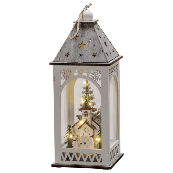 Konstsmide 3271-210 är en lanterna med kyrka, vit, med 8 varmvita LED. 2xAA. Timer på 6h.