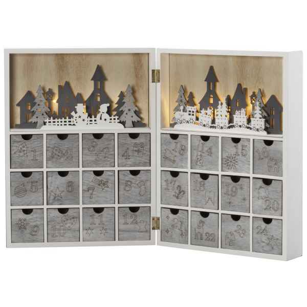 Konstsmide 3283-210 är en siluett av adventskalender, vit, med 8 varmvita LED. Timer på 6h. 2xAA.