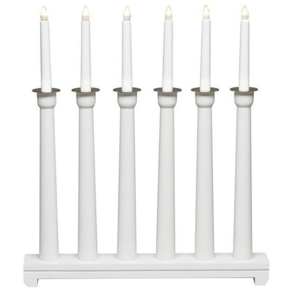 Art.nr: 3058338En ljusstake i vitt trä med sex stycken ljus och en totalhöjd på 50 cm. Anslutningssladden är 1.7 meter.