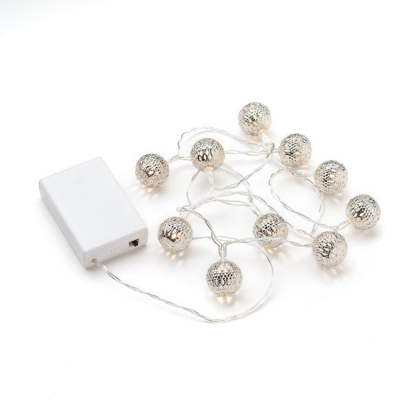 Konstsmide 3188-303 är en ljusslinga med 10 små metallbollar, varmvita LED. 3xAA.
