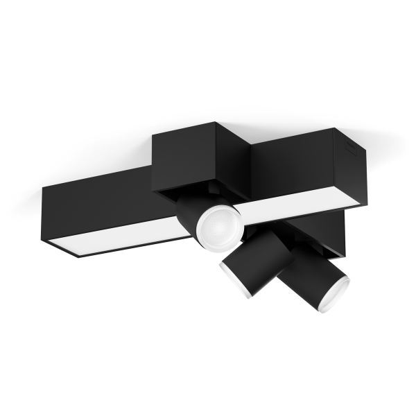 Art.nr: 4073406Philips Hue Centris spotlight är en smart lampa som kombinerar stämningsbelysning och funktionellt ljus för större eller flerfunktionella ytor, till exempel ett kombinerat kök och vardagsrum eller en hall där spotlights kan användas för att belysa förvaring, hyllor och dekorationer. Design och användningsområdenDen svarta armaturen har en central ljuspanel och tre justerbara spotlights placerade i ett kors, vilket gör det möjligt att rikta ljuset mot specifika ytor eller objekt samtidigt som ett jämnt grundljus sprids i rummet.
