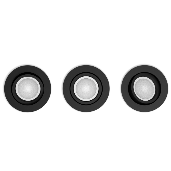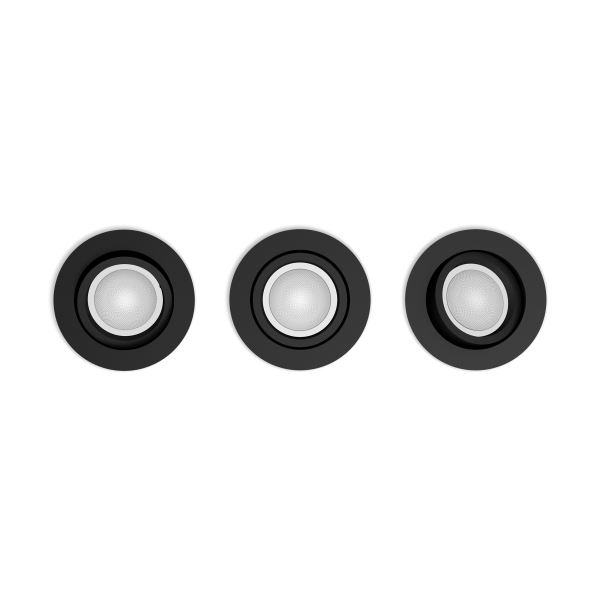 Philips Hue downlight Centura 929003809501 är en familj av infällda spotlights med en modern och subtil design som passar i alla hem. Denna variant levereras som ett 3-pack med rund design i svart och ingår i White and color ambiance-serien, vilket innebär att ljuset kan dimmas, justeras mellan varma och kalla vita nyanser och ställas in på valfri färg med mer än 16 miljoner nyanser att välja mellan.
