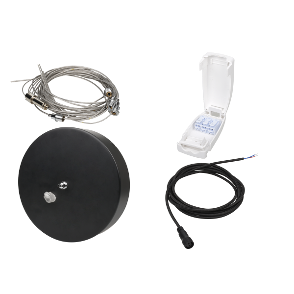 Wire Kit som är avsett för justerbar takupphängning av plafond RING 36/600 från Aneta Lighting. Tråden har en längd på 5 m. Snabbkoppling till RING 36/600 plafond, innehåller textilkablar och tillhörande kopplingsdosa för att hålla klass II. Tillgänglig i färgerna vit och svart.