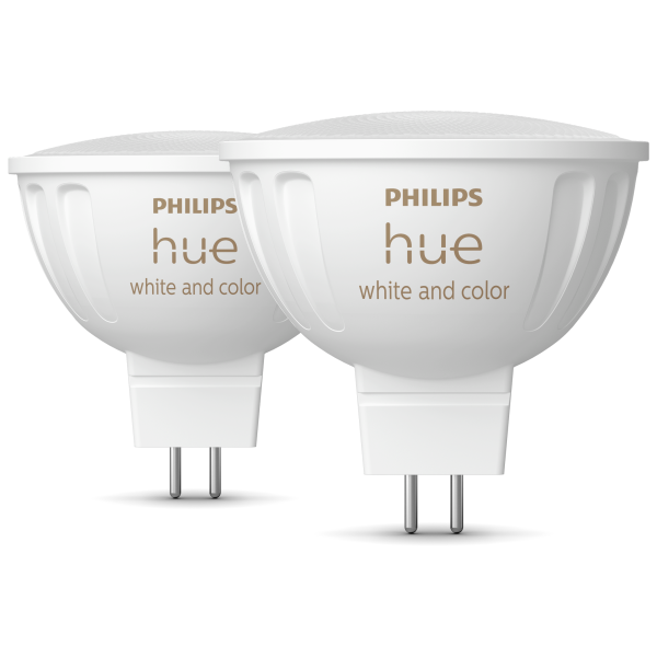 Philips Hue ljuskälla är en MR16-lampa som säljs i 2-pack och ger smart, justerbar belysning för befintliga 12 V-armaturer. Den tvåstifts 12 V-designen passar i vanliga MR16-armaturer, så du kan byta ut glödlampan utan att behöva ta bort eller byta ut transformatorn.