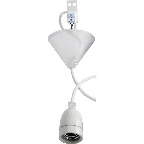 Art.nr: 2811900Lampupphäng med vit textilkabel, lamphållare i porslin, sladdförkortare, snabbkoppling och transparent takkåpa med sidoskruv.