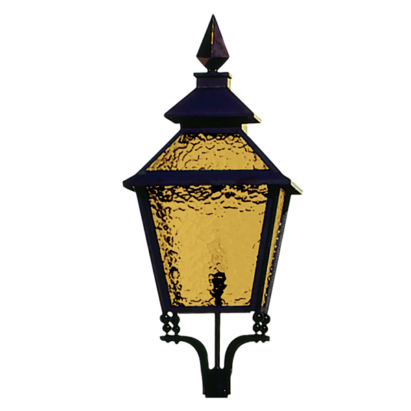 Klassisk, handgjord stolparmatur i oxiderad koppar/svart smide med rotationssymmetrisk ljusbild. Med kabelavlastning och snabbkopplingsplint 3x2x2,5 mm2. Armaturen är för utomhusbruk och passar för bruk både i privat och offentlig miljö. Välj mellan klart eller gult hamrat katedralglas, alternativt klart fönsterglas.