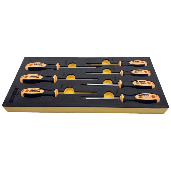 Innehåller 7 skruvmejslar; TX10-TX15-TX20-TX25-TX27-TX30-TX40. Specialhärdat krommolybdenvandistål. Svartoxiderad spets. Ergonomiskt skaft i tvåkomponentsmaterial.