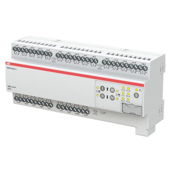 Den kompakta kombiaktorn har 8, 16 eller 24 oberoende utgångar (ej elektromekaniskt sammankopplade). Utgångarna kan användas individuellt via ABB i-bus KNX för omkoppling av elektriska laster eller parvis för styrning av 230 V AC jalusier eller markiser. Enheten har en manuell styrning, som också kan inaktiveras. Via manuell manövrering kan utgångarna manuellt köras och växlings- eller körstatus visas. Enheten drivs av busspänning och kräver ingen extra strömförsörjning.