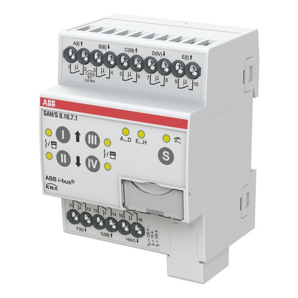 Den kompakta kombiaktorn har 8, 16 eller 24 oberoende utgångar (ej elektromekaniskt sammankopplade). Utgångarna kan användas individuellt via ABB i-bus KNX för omkoppling av elektriska laster eller parvis för styrning av 230 V AC jalusier eller markiser. Enheten har en manuell styrning, som också kan inaktiveras. Via manuell manövrering kan utgångarna manuellt köras och växlings- eller körstatus visas. Enheten drivs av busspänning och kräver ingen extra strömförsörjning.