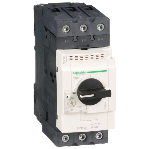 GV3 P är en 3-polig motorskyddsbrytare med termiskt och magnetiskt skydd mot överlast och kortslutning. GV3 P erbjuder 7 olika storlekar med inställningsområden 9- 65A. Brytförmågan Icu 100kA från 9-32A och Icu 50kA från 40-65A vid 400V. Det magnetiska skyddet Id mag (kortslutningsskyddet) har en fast utlösningsnivå som är 13 gånger den maximalt inställbara strömmen för termisk utlösning. GV3 P har byggbredd 55 mm. GV3 P har ett roterande 3 positionsvred. GV3 P är specialkonstruerat för manövrering och skydd av motorer enligt standardena IEC 947-1, IEC 9 47-2 och UL/CSA; UL 508 typ E certifikat.