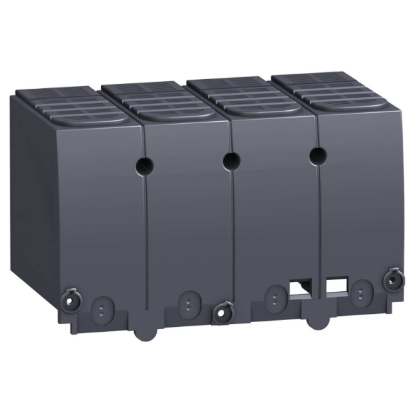 - Den övre delen är utrustad med förskjutbara galler med brytmarkeringar för en exakt anpassning av kablar eller isolerade skenor. Den bakre delen är fullständigt frånskiljd från anslutningsområdet. Delvis skurna kvadrater kan tas bort för att kunna anpassa varje typ av anslutning med kabelskor eller kopparskenor.