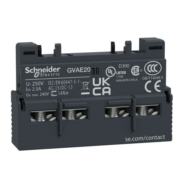 Schneider Electric GVAE20 hjälpkontaktblock, TeSys GV2 & GV3, 1 slutande eller 1 brytande. Vändbar, frontmonteras. Max 1 frontmonterad och 2 sidomonterade block per GV-brytare.
