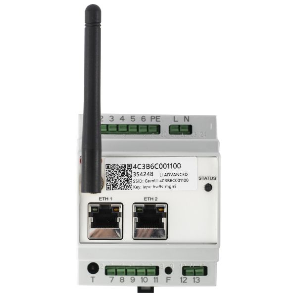 Art.nr: 4000131GARO Entity Balance Advanced effektenhet har två Ethernetportar (RJ45) för nätverksanslutning, utförda som en tvåports-switch. En SMA-antenn på 90 mm möjliggör WiFi Mesh till laddstationer och Internetuppkoppling via WiFi.