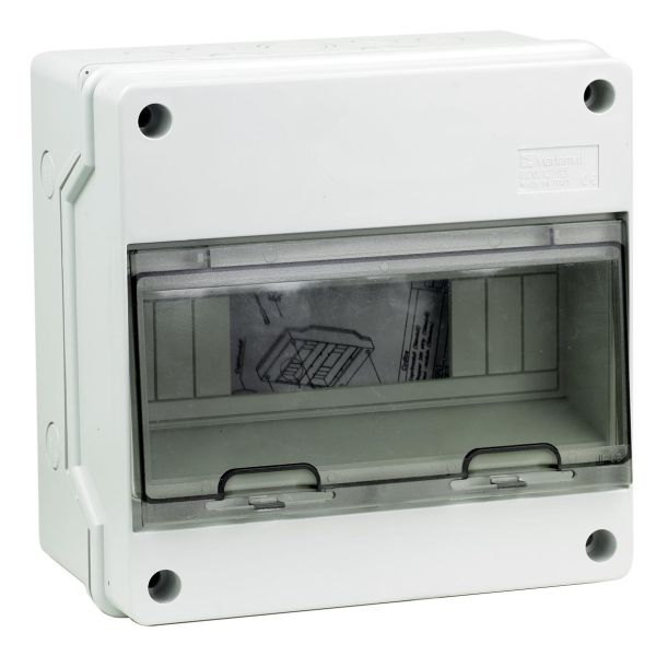 Normkapsling med DIN-skena av metall samt plintar för jord och nollanslutning. Försedd med "knockout" på alla sidor för olika kabeldimensioner. Tillverkad av slagtålig och halogenfri plast. Rökfärgat och transparent lock. Kapslingsklass IP65.