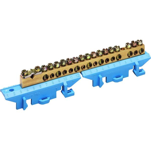 Art.nr: 3028398Mässingsplintar för N-anslutning med sockel för DIN-montage. Har åtta 16 mm²-anslutningar, åtta anslutningar på 10 mm² och en 25 mm²-anslutning.