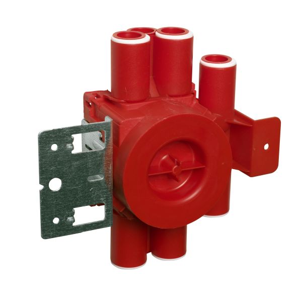 Apparat- och kopplingsdosa för montage på stål- eller träreglar i skivväggar med enkel eller dubbelgips. Försedd med teleskopiskt självjusterande ring och med stutsar för 16 och 20mm rör.
