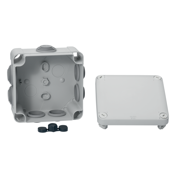 Utvändig kopplingsdosa med skruvlock för säkerhetsinstallationer exempelvis brandlarmsinstallationer. Med kabeltätningar. Temp.område 960° IK07 Material: PP (polypropylen), isolerande.