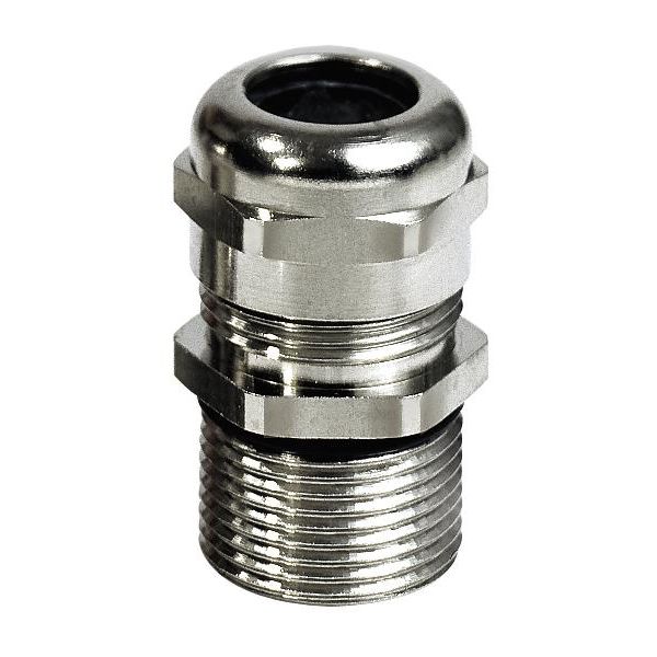 Tillverkad av förnicklad mässing med metrisk gänga. Goda avlastningsegenskaper och en helisolerande innersida med neoprenpackning samt o-ring vid yttergängan.