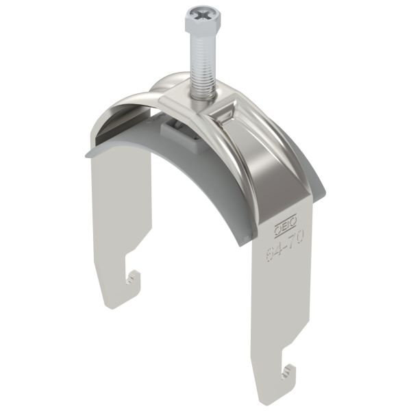 OBO Bettermann kabelhållare är avsedd för lodrät och vågrät montering på C-profilskena. Klämman och skruven är tillverkade av rostfritt stål 1.4301 och inlägget är i polypropen (PP); samtliga tre komponenter levereras utan ytbehandling. Fastspänningsområdet är 64–70 mm och för metriska rör anges dimension 70 mm. Produkten är halogenfri, saknar kontrainlägg och rymmer maximalt en kabel.