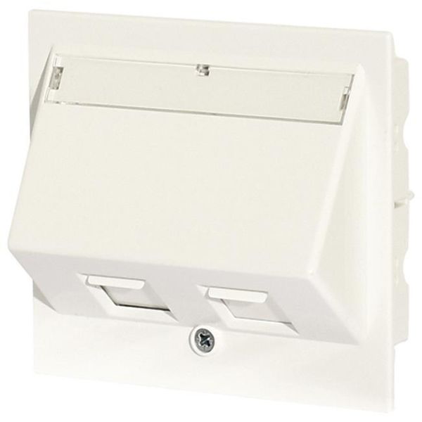 Ett vitt datalock med märkfönster för 2xRJ45 hålbild Systimax. Hålmått 17,9x17,2 mm.
