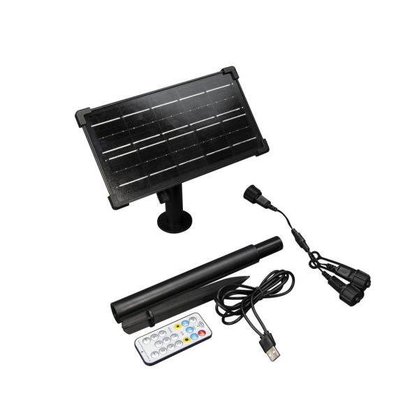 Uppladdningsbar batterilåda med solceller för upp till 400 LED till Konstsmides vanliga utomhusprodukter med 24V-31V. Kan laddas inomhus med medföljande USB-kabel på 1,8 m eller via solen. Fjärrkontroll med timer 4/6/8 timmar, dimmer, sensor och multifunktion medföljer. Markspets ingår.