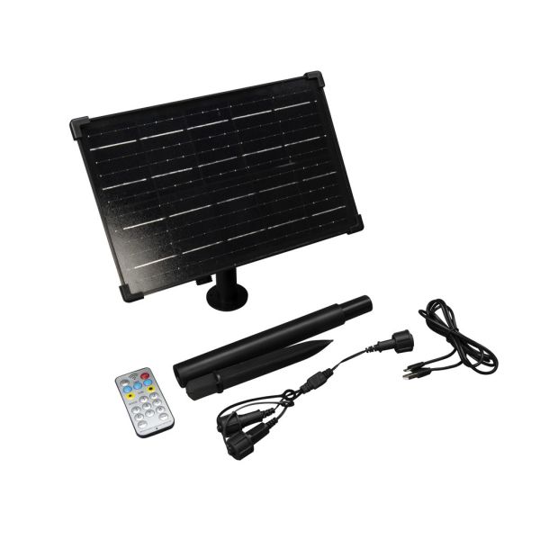 Uppladdningsbar batterilåda med solceller för upp till 600 LED till Konstsmides vanliga utomhusprodukter med 24V-31V. Kan laddas inomhus med medföljande USB-kabel på 1,8 m eller via solen. Fjärrkontroll med timer 4/6/8 timmar, dimmer, sensor och multifunktion medföljer. Markspets ingår.
