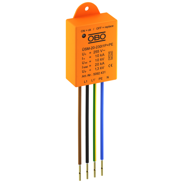 Överspänningsskydd Typ.2+3. Lämpligt för tex.LED armaturer. Inkoppling i serie eller parallellt. Maximal avledningsström (8/20) 20kA. Maximalbelastning 16A. Maximalspänning 255V. Restspänning max 1,5kV L/N-PE & L-N 1,3kV. Lysdiod för förbrukat skydd. Grön diod skydd ok, släkt diod förbrukat skydd. För montage i stolpe/mast, apparatskåp eller direkt i armatur. Huset är försedd med monteringsögla. Skyddsklass IP20