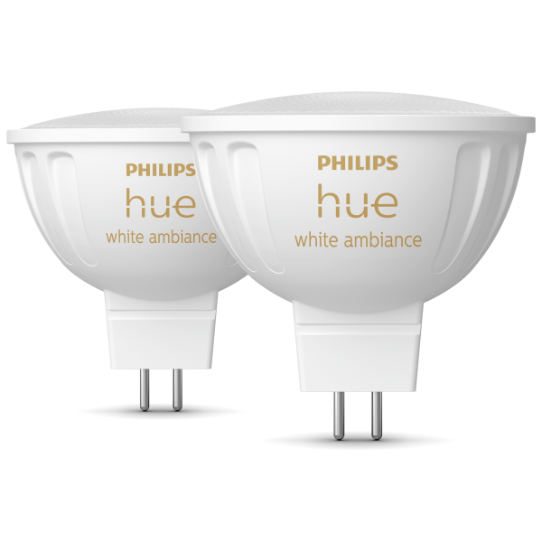 Philips Hue MR16-lampor levereras som ett 2-pack och ger justerbart ljus som sträcker sig från varmvitt till kallvitt, med full dimbarhet från klart till dämpat nattljus så att du kan anpassa både nyans och ljusstyrka efter aktivitet. Lamporna använder samma 12 V lågspänning som vanliga MR16-lampor, vilket innebär att du normalt inte behöver ta bort eller byta ut din befintliga transformator. Tvåstiftsdesignen gör att de passar i standardarmaturer för MR16.