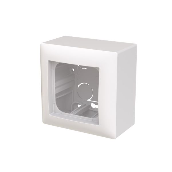 Utanpåliggande monteringsdosa SAGA för en 1-fack med 85 mm bredd. Denna låda är hög, med en total höjd på 53 mm. Den är lämplig för enheter med maximalt installationsdjup på 36 mm. Enheten består av bottenplatta och överdel. Biocirkulär plast används i botten- och centrumplattan.
